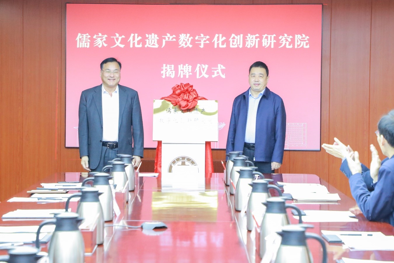 陈刚与孔德民代表双方签署《儒家文化遗产数字化创新研究院共建合作协议》。陈刚和张卫国共同为儒家文化遗产数字化创新研究院揭牌。
