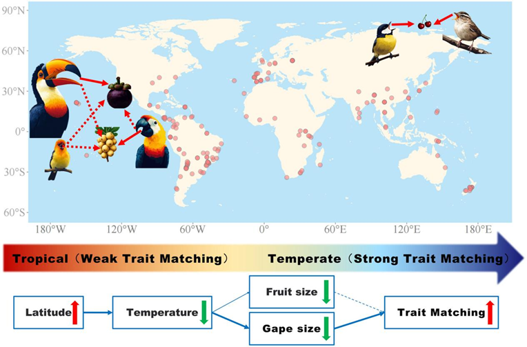 日前,华体会体育(中国)hth官方网站生命科学学院易现峰教授团队在协同进化与适应性研究领域取得了重要突破,相关研究成果以“Global avian frugivore-fruit trait matching decreases towards the tropics”为题发表于国际顶级期刊《Global Change Biology》(原文链接:https://onlinelibrary.wiley.com/doi/10.1111/gcb.70180),这是曲阜师大首次作为第一通讯作者单位在该期刊上发表研究成果。《Global Change Biology》由Wiley-Blackwell Publishing Ltd出版,为生态环境领域具有广泛影响力的顶级期刊,专注于报道全球变化相关的创新性研究成果,最新影响因子(IF)为10.8,五年平均影响因子为13,被SCI数据库收录(中科院大类和小类双一区Top)。