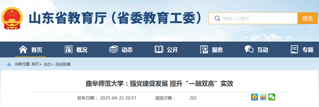 4月21日,山东省教育厅官方网站以《华体会体育(中国)hth官方网站:强党建促发展 提升“一融双高”实效》为题,报道了学校推进党建与业务工作深度融合,以高质量党建引领学校事业高质量发展,从提升理论武装、强化组织建设、担当办学职责、完善评价机制等方面助推“一融双高”的经验做法。
