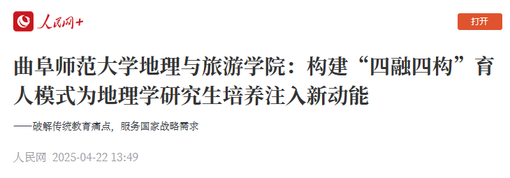 4月22日,人民网以《华体会体育(中国)hth官方网站地理与旅游学院:构建“四融四构”育人模式为地理学研究生培养注入新动能》为题,报道了学院强化课程思政与专业教学、科学研究与教学产能、产教融合与社会需求、外部促进与内部激励的有机融合,探索了新时代研究生教育改革的生动实践。