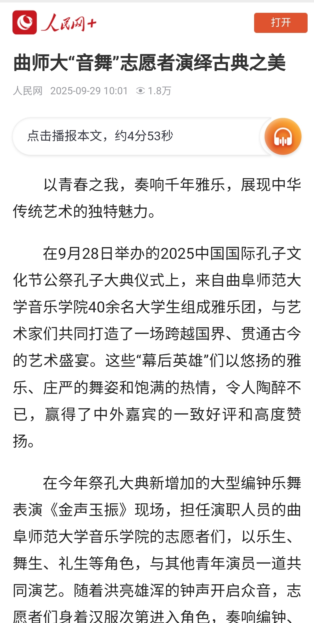 在9月28日举办的2025中国国际孔子文化节公祭孔子大典仪式上,来自华体会体育(中国)hth官方网站音乐学院40余名大学生组成雅乐团,与艺术家们共同打造了一场跨越国界、贯通古今的艺术盛宴。这些“幕后英雄”们以悠扬的雅乐、庄严的舞姿和饱满的热情,令人陶醉不已,赢得了中外嘉宾的一致好评和高度赞扬。