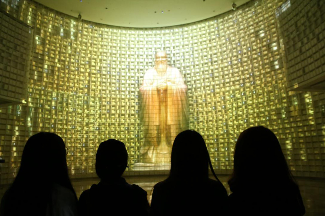 序厅环幕投影以“天不生仲尼,万古如长夜”短片为观众开启了追溯历史长河之旅。厅内圆形的书筒墙上装满了各种儒家典籍,恢弘壮观,体现儒家千年文脉的延续。孔子博物馆展现了孔子从治学弘道到教书育人,从人生哲学到治国理政,从反思历史到认识万物的思想智慧。