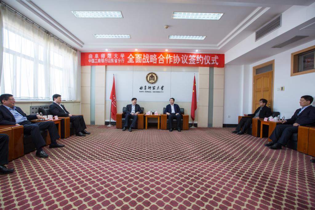 3月15日上午,我校与中国工商银行山东省分行签署全面战略合作协议。中国工商银行山东省分行副行长徐光林,中国工商银行山东省分行机构业务部总经理许龙,中国工商银行济宁分行行长鞠立坤、日照分行行长杨明,来校出席签约仪式。校长张洪海、副校长王继锁会见了徐光林一行。中国工商银行济宁分行与曲阜支行有关负责人,我校财务处负责人,共同参加签约仪式。